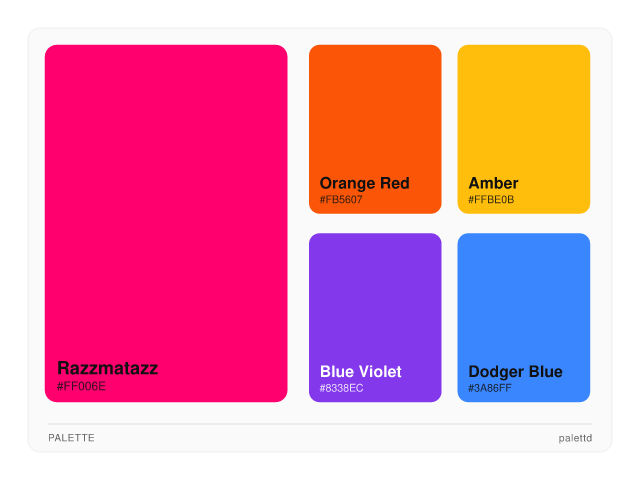 rgb(255, 0, 110)hsl(334, 100%, 50%)