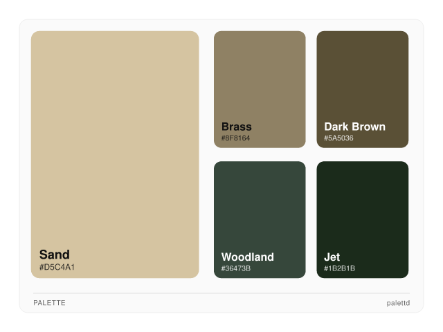 #6F4E37#B68D40#D6AD60#F4EBD0#122620